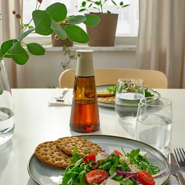 جا روغن و آبلیمو ایکیا مدل HALVTOM از دیگر لوازم کاربردی و شیک برای میز پذیرایی و غذاخوری هر منزلی است. این بطری با دهانه به اندازه و کاربردی خود برای روغن، سرکه یا سس سویا مناسب است که میخواهید هنگام پختن غذا روی سالاد یا داخل تابه بریزید. به راحتی درب آن را میبندید تا محتویات درون آن در مدت زمان بیشتری تازه بمانند. همچنین رنگ قهوهای شیشه آن اثرات نور خورشید را کاهش میدهد و طعم محتویات بیشتر حفظ میشود. وقتی از داخل شیشه می بینید که محتویات در حال تمام شدن هستند، به سادگی درپوش را باز کرده و دوباره پر کنید. همچنین برای تمیز کردن، قابلیت شستشو در ماشین ظرفشویی را دارد. خرید جا روغن و آبلیمو ایکیا مدل HALVTOM در کنار سایر لوازم این سری مدل از ایکیا حس متفاوت و زیبایی را به میز شما خواهد بخشید.