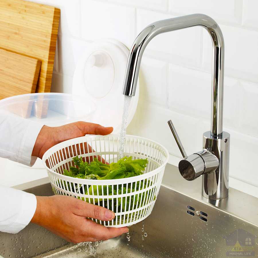 سبزی خشک کن ایکیا مدل UPPFYLLD یک وسیله مدرن و شیک برای خشک کردن انواع سبزیجات و سالادها است. در سینک آشپزخانه، سالاد یا سبزی داخل سبد را آبکشی کنید و سپس سبد را در اسپینر قرار دهید و با دسته آن را بچرخانید. آب اضافی به کاسه میرسد و سالاد و یا سبزی شما دیگر خیس نیست. از کاسه آن نیز به عنوان وسیله سرو نیز میتوانید استفاده کنید. حواستان باشد سبزی خشک کن ایکیا را فقط با دست بشورید.