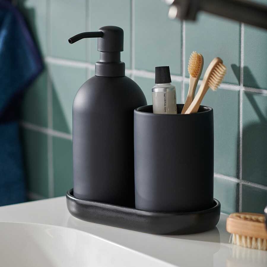 ست سرویس بهداشتی ایکیا مدل GANSJON، یک محصول با طراحی مدرن و رنگ خاص است. ظروف سنگی مات تیره،حس لطیفتر و پر از آرامش به شما میدهند. این ست سرویس بهداشتی ایکیا شامل سه تکه است. سینی آن برای نگهداری صابون مناسب است. البته بعضیا برای نگهداری شمع یا لوازم جانبی کوچکان استفاده میکنند. در صورت کثیف شدن این سرویس بهداشتی ایکیا،کافیست با یک پارچه مرطوب آن را تمیز کنید و در انتها خشک کنید.