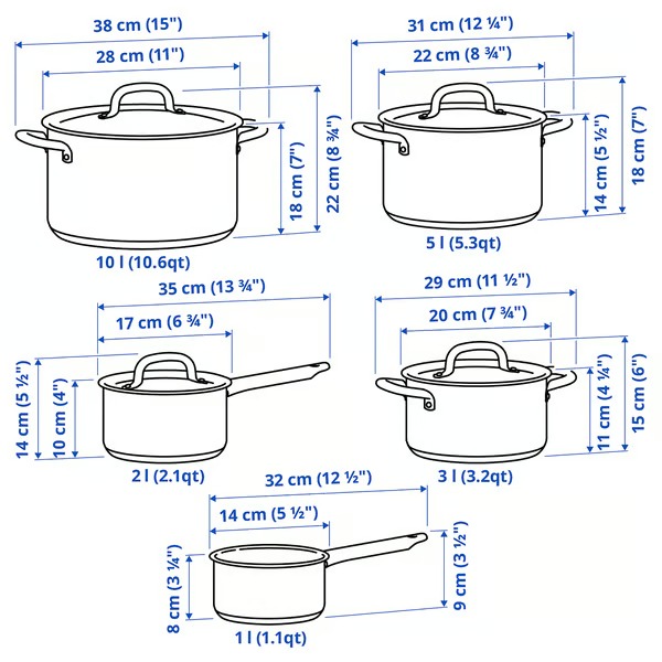1 قابلمه با درب (10 لیتر)، 1 قابلمه با درب (5 لیتر)، 1 قابلمه با درب (3 لیتر)، 1 قابلمه با درب (2 لیتر) و 1 قابلمه بدون درب (1 لیتر). |