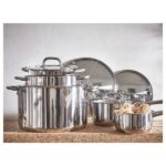 سرویس 9 پارچه قابلمه استیل ایکیا مدل ، یکی از پرفروش ترین مدلهای ظروف آشپزخانه ایکیا به شمار میرود. این سرویس قابلمه طراحی ساده و تمیزی دارد و استفاده از آن آسان است. جنس استیل ضد زنگ و کف پهن آن باعث میشود سریع گرم شود و تنظیم دما بر اساس نوع غذایی که میپزید آسانتر است. این سرویس قابلمه روی انواع اجاق گاز، از جمله اجاق القایی، به خوبی کار میکند. اگر نیاز داشتید در فر هم میتوانید استفاده کنید. دستههای قابلمه طوری طراحی شدهاند که انتقال حرارت را کاهش دهند و بلند کردن قابلمه را آسان میکند.