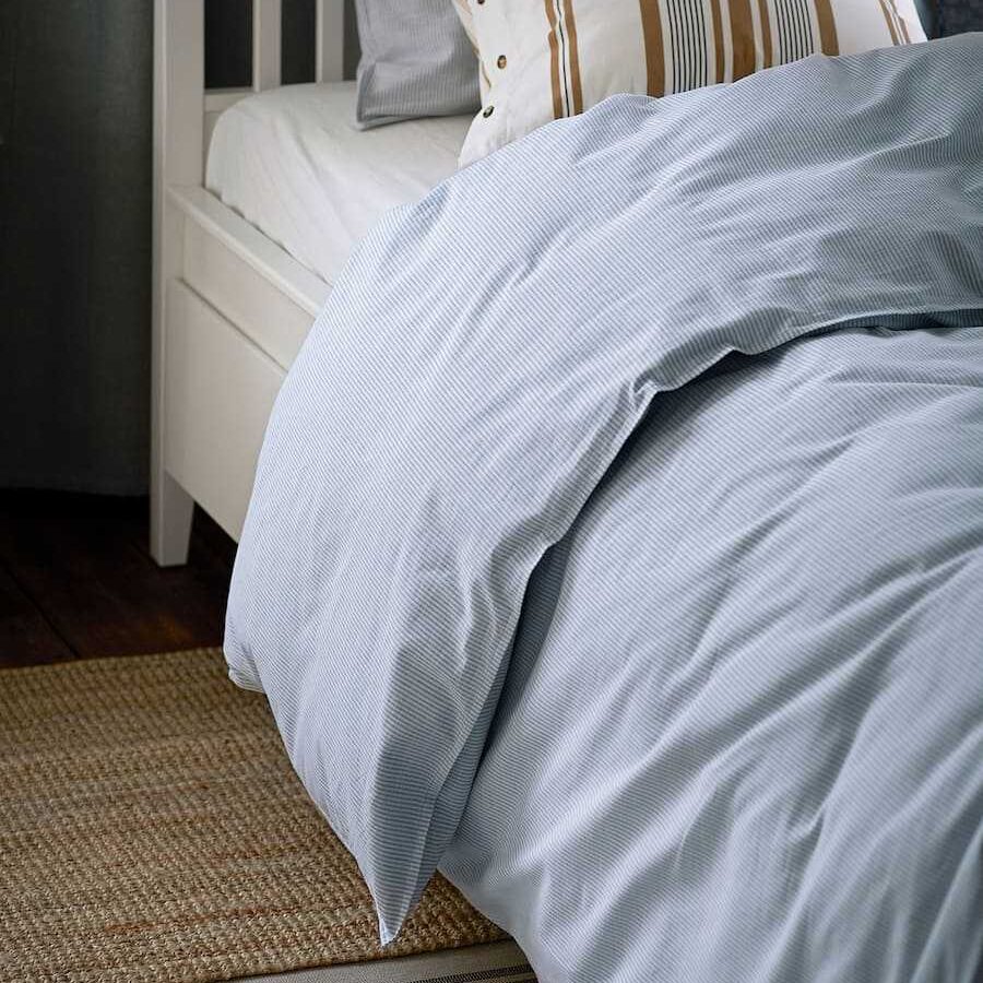 کاور لحاف و روبالشی دو نفره ایکیا مدل BERGPALM، از جنس 100 درصد پنبه یکی از محصولات جذاب کالای خواب ایکیا میباشد. این کاور لحاف دارای نوارهای کلاسیک و رنگ شده با نخ است. وجود نخهای ضخیمتر، حالتی دستساز و قدیمی ایجاد کرده که احساس آرامش ایجاد میکند و شما را به آرامش دعوت میکند. پنبه یک جنس با دوام بوده و در مواجهه با پوست نیز نرم است. درضمن با هر شستشو نرمتر میشود.